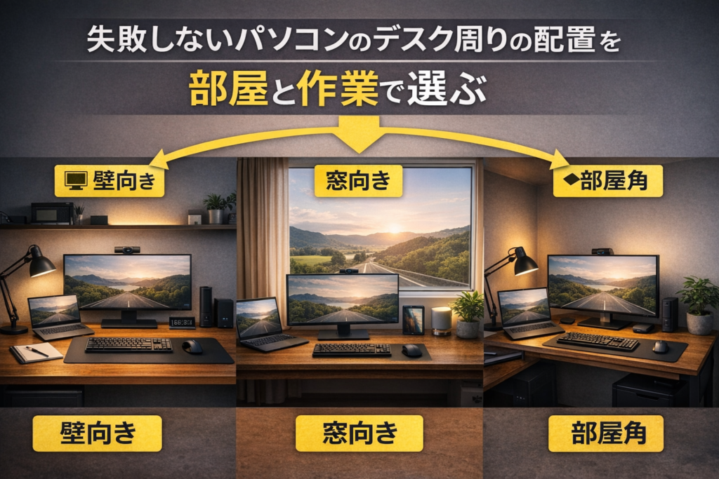 パソコンデスク周り配置は、流行りのレイアウトを真似るより、目線→動線→定位置の順番で整えると失敗しにくいです。最初から全部を完璧にする必要はありません。